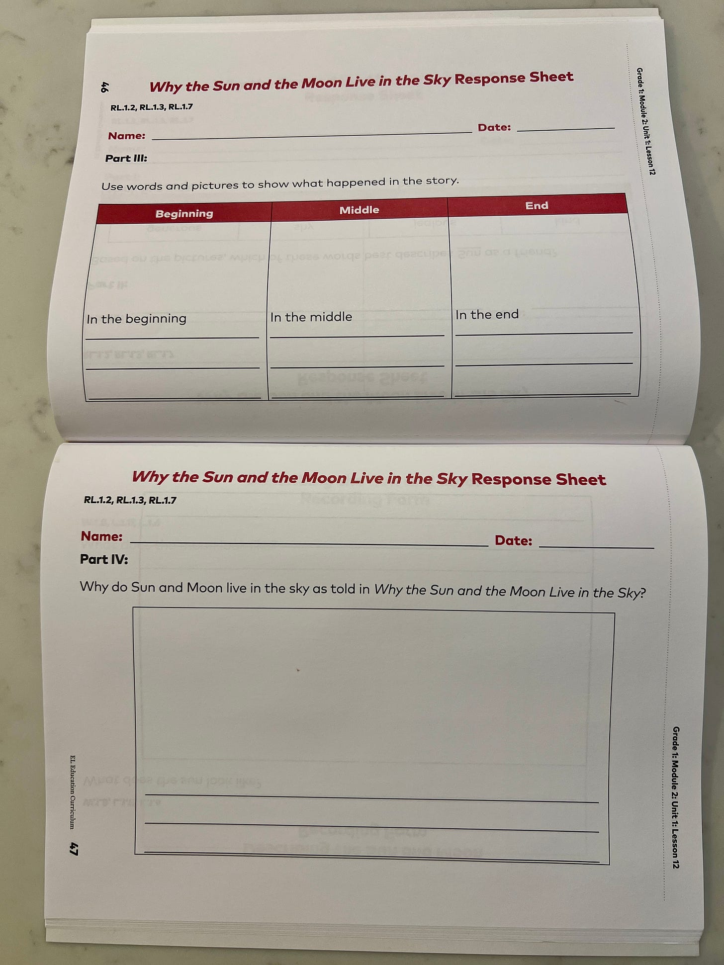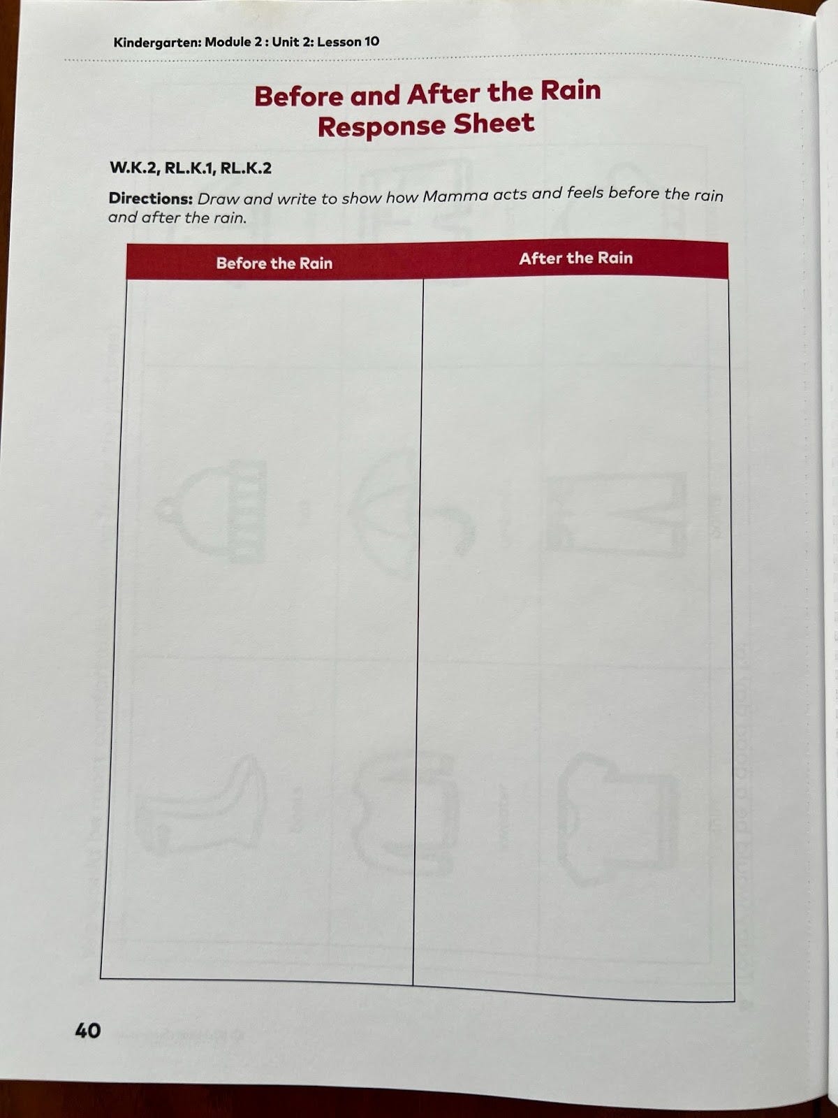 In Module 2, students read Come On, Rain! by Karen Hesse. After discussing the book, students complete a “Before and After the Rain” activity, capturing how the characters and environment changed (from hot/dry to cool/rainy).
